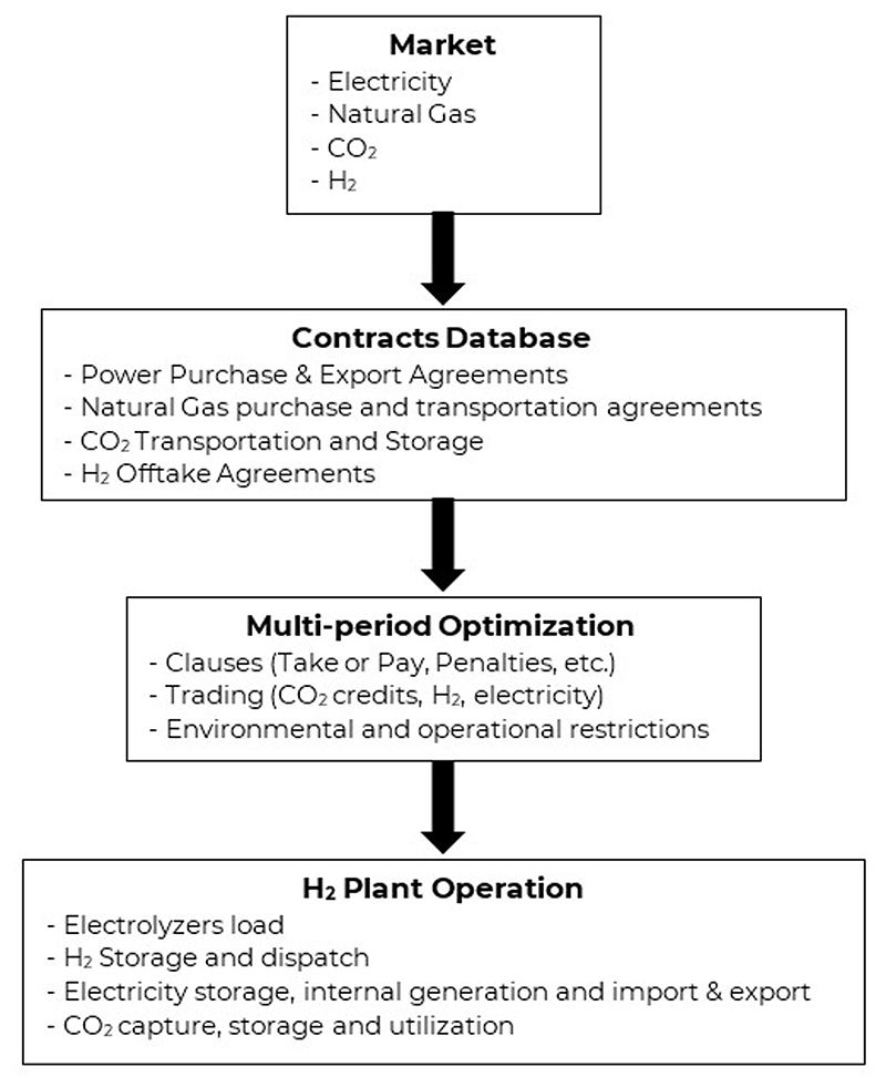 Real-time and multi-period optimization align H2 production with electricity prices, renewable availability, and downstream demand. Viability depends on respecting contract realities — power purchase agreements, take-or-pay clauses, and H2 offtake commitments — which act as hard constraints alongside market signals. Storage — batteries or H2 tanks — adds flexibility. It buffers volatility instead of amplifying it.